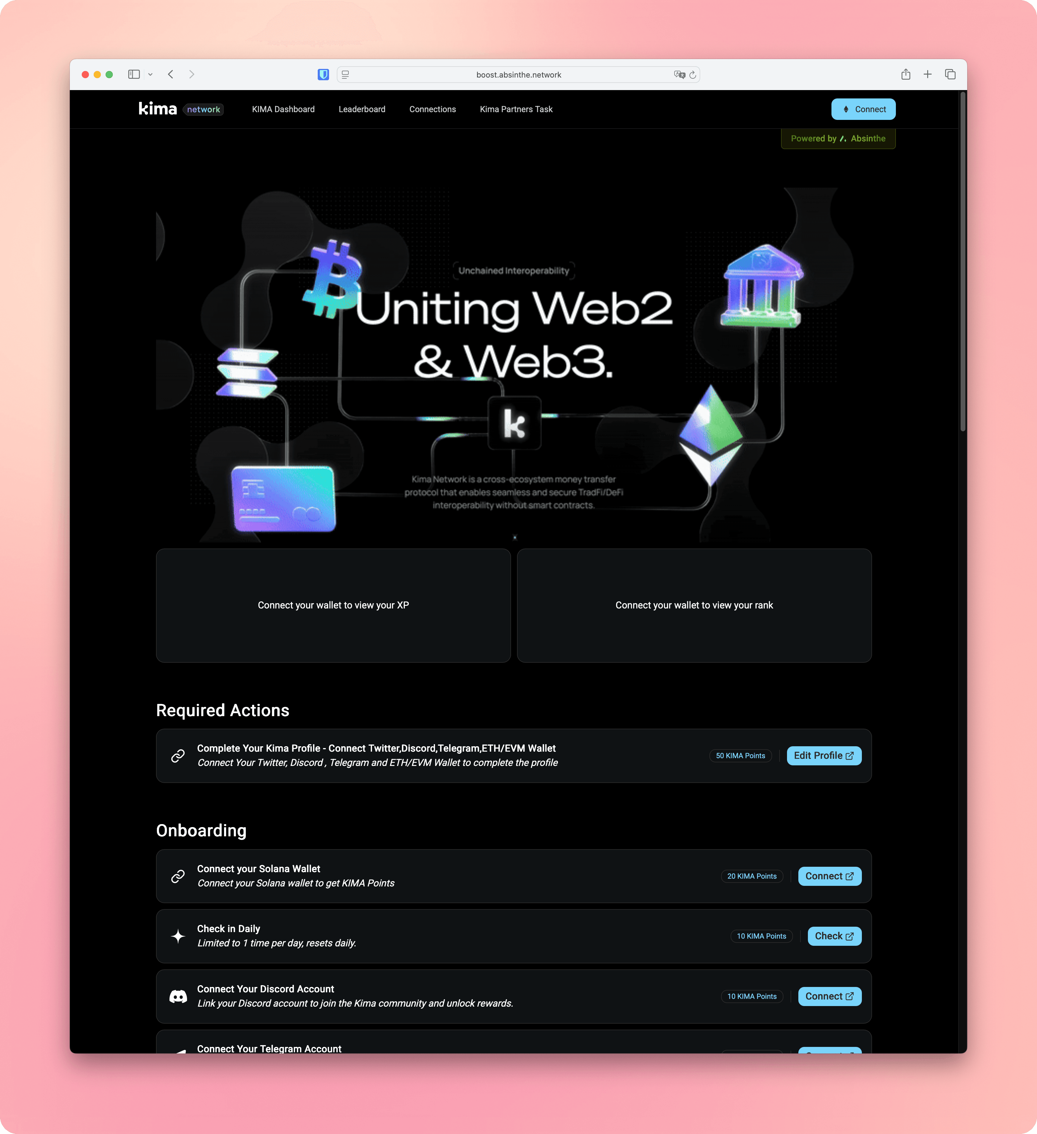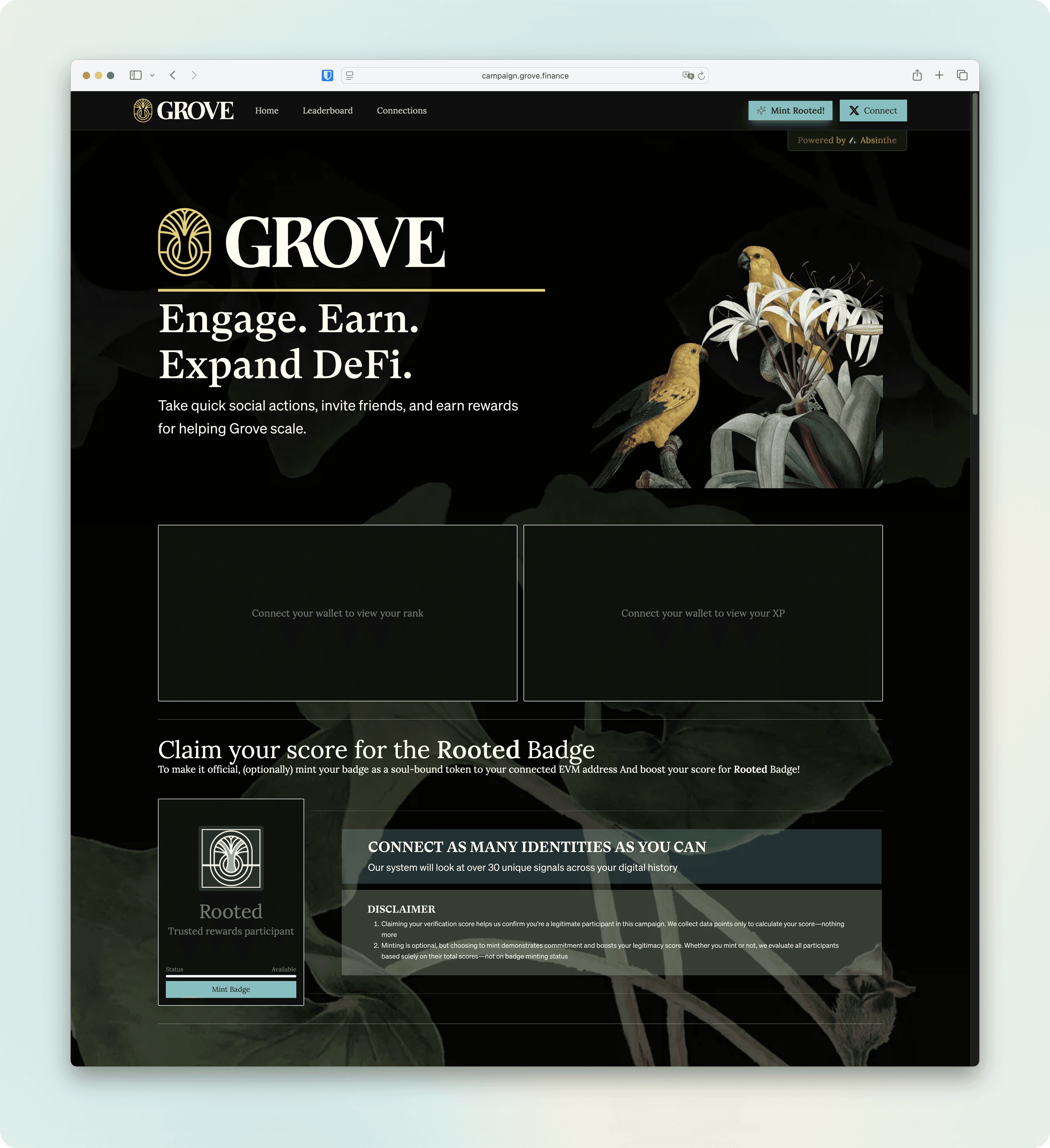 The onboarding is the funnel. Users connect their identities, complete social actions (follow, retweet, submit content), claim quest scores, refer friends, and check their rank. Every step guides them toward the bottom-of-funnel actions the client actually cares about, deposits, stakes, mints, happening on the client's platform.